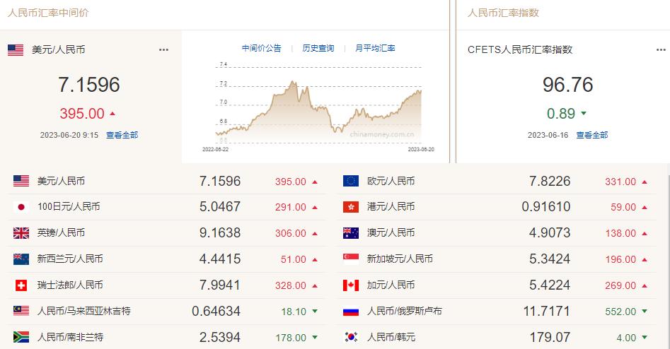 6月20日,人民币兑美元中间价报7.1596,调贬395个基点。前一交易日中间价报7.1201,在岸人民币16:30收盘价报7.1583,夜盘收报7.1620。
