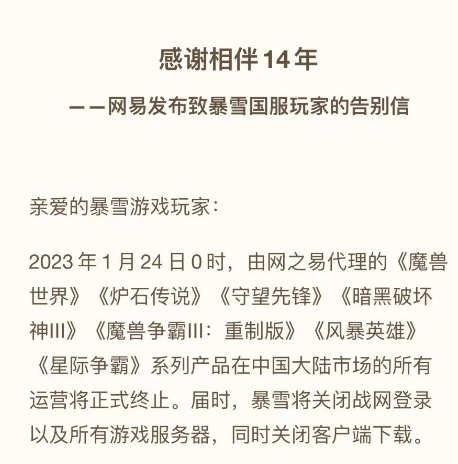 去年11月,暴雪发布声明称,由于同网易的现有授权协议将在2023年1月23日到期,届时将暂停大部分暴雪游戏服务。