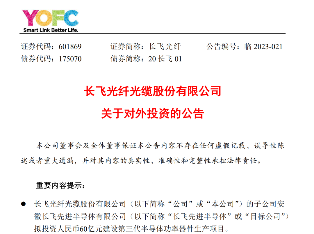6月26日,长飞光纤董事会审议通过了《安徽长飞先进半导体有限公司2023年增资及融资计划》,同意长飞先进半导体投资60亿元建设第三代半导体功率器件生产项目,其中包括约36亿元的股权融资及约24亿元的银行贷款。