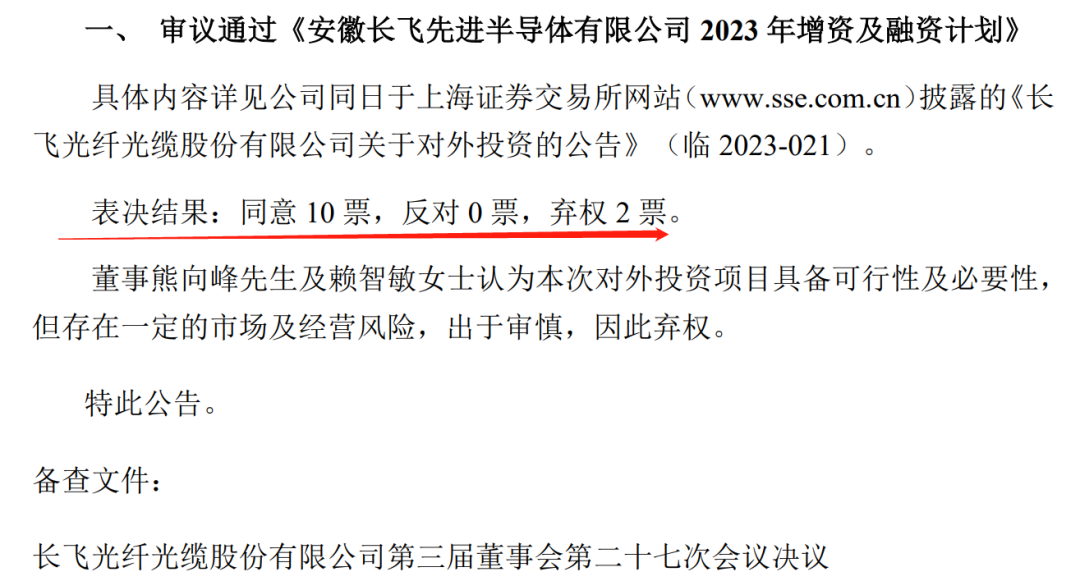 本次长飞光纤董事会所审议的上述2023年增资及融资计划,表决结果为同意10票、反对0票、弃权2票。其中,长飞光纤董事熊向峰、赖智敏认为,本次对外投资项目具备可行性及必要性,但存在一定的市场及经营风险,出于审慎,因此弃权。