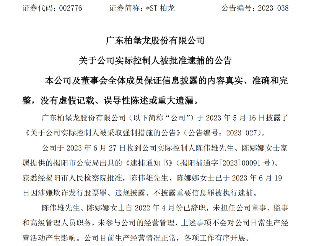 6月28日晚,*ST柏龙(002776)公告,公司实际控制人陈伟雄、陈娜娜已于6月19日因涉嫌欺诈发行股票罪、违规披露、不披露重要信息罪被执行逮捕。