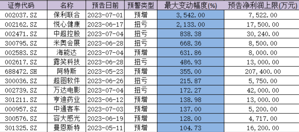 整体来看,70家业绩预增公司中,有57家预计净利润最高增幅超过20%。其中,13家公司的预计增幅上限超过100%。保利联合(002037.SZ)和悦心健康(002162.SZ)、中超控股、米奥会展(300795.SZ)和海能达的净利润增幅位居前五。保利联合与悦心健康的净利润预计增速超过10倍,分别为3542%和2133%。