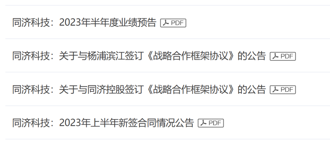 值得注意的是,在该次交流会的前一晚,同济科技曾一口气发布了包括2023年半年度业绩预告、2023年上半年新签合同情况以及与两家相关方签订的《战略合作框架协议》在内的多份公告。