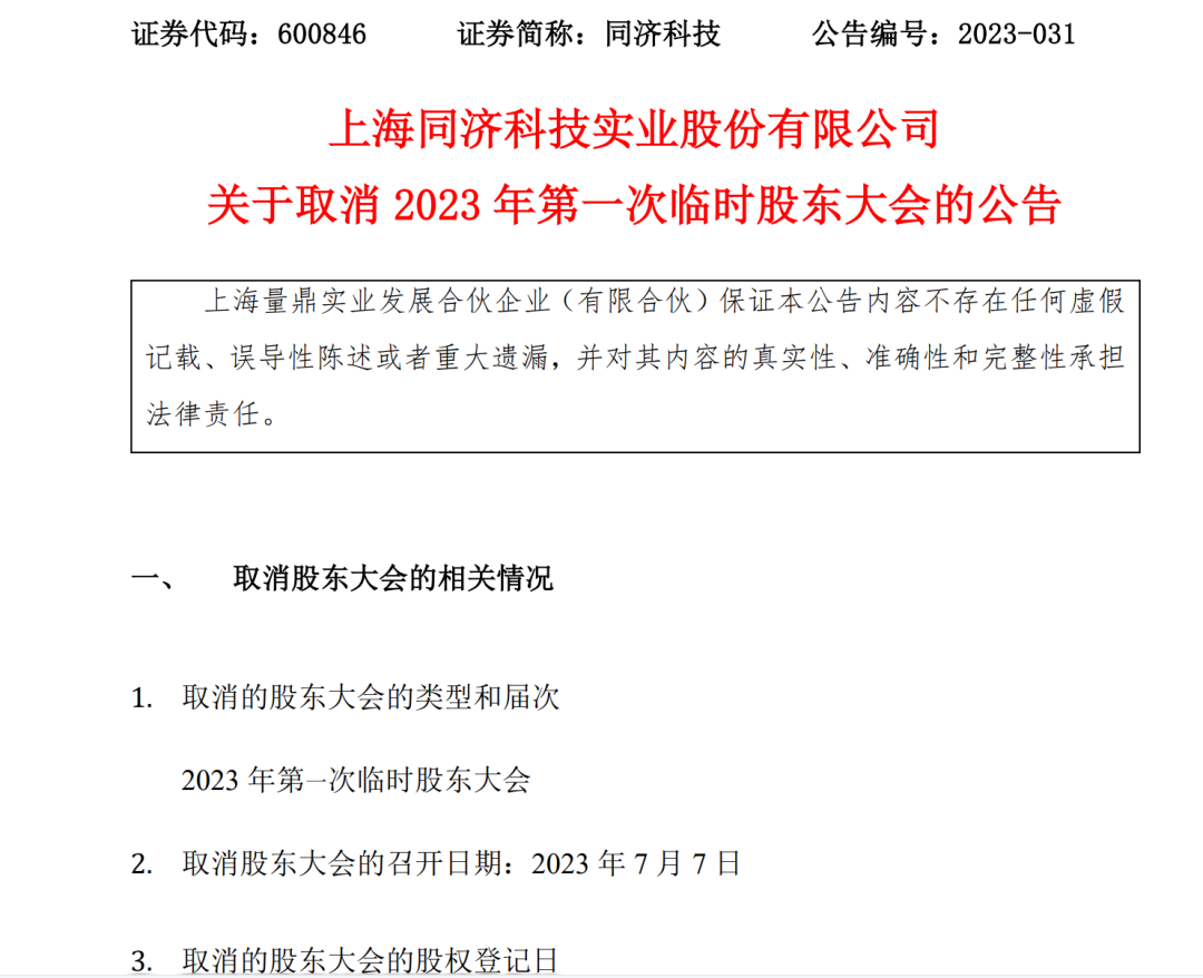 “鉴于2023年6月28日召开的同济科技2022年年度股东大会,包括《2022年年度报告及摘要》、《2023年度投资计划》以及《2023年度财务预算报告》等17个议案均未获通过。在此情形下,作为本次临时股东大会的召集人,量鼎实业从维系上市公司经营环境、维护全体股东利益的角度,决定先行取消召开本次临时股东大会。”量鼎实业在当晚公告中表示。