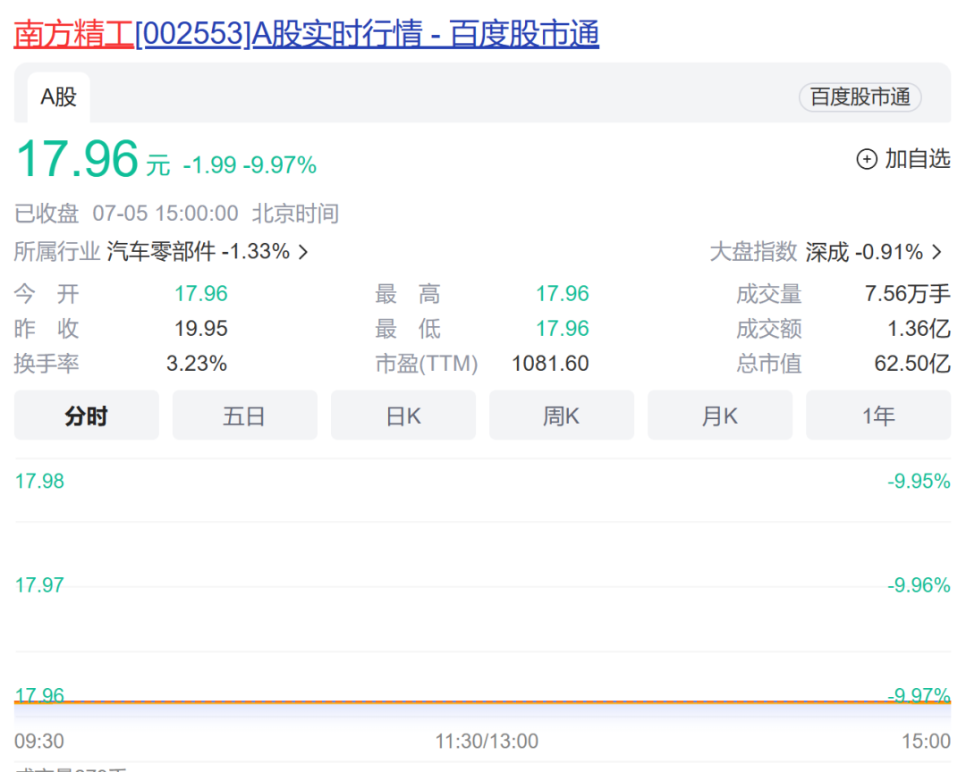 7月5日,南方精工“一”字跌停,截至收盘,仍有34.8万手卖单。而在此前,该公司曾因在互动平台为谈及减速器,上演了一波“4连板”走势。同日,昊志机电跌幅一度达到19.9%,最终收盘于-16.09%。