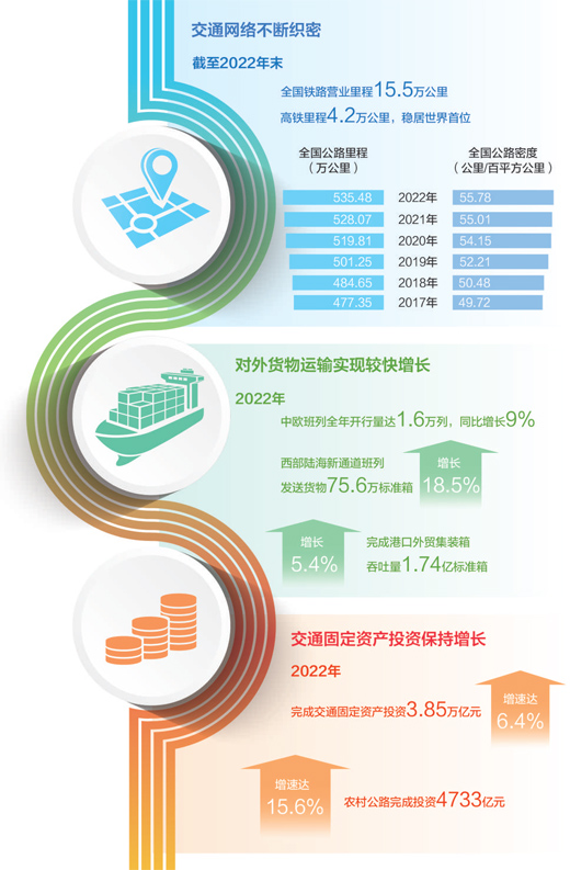 “覆盖空间大、通达程度深、惠及面广的基础交通设施网络进一步织牢,在‘末端末梢’人民群众出行、货运物流服务方面发挥了重要的保障作用。”周健说,以农村公路为例,2022年,农村公路里程增加6.54万公里,其中乡镇通三级及以上公路比例达到84%,老少边及脱贫地区公路建设有序推进,有效提高交通运输均等化水平。
