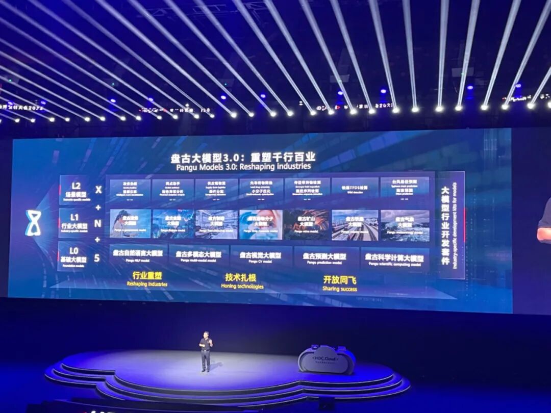 7月7日下午,华为开发者大会2023(Cloud)在东莞拉开帷幕,证券时报·e公司记者亲历现场。华为在这场大会上披露了盘古大模型的几大重要进展:第一,华为云盘古大模型3.0版本正式发布,包含五个基础大模型、N个行业大模型以及更多细分场景模型;第二,盘古大模型首次明确行业定位,将深耕行业,拟重塑千行百业;第三,盘古大模型迎来首次重大升级。
