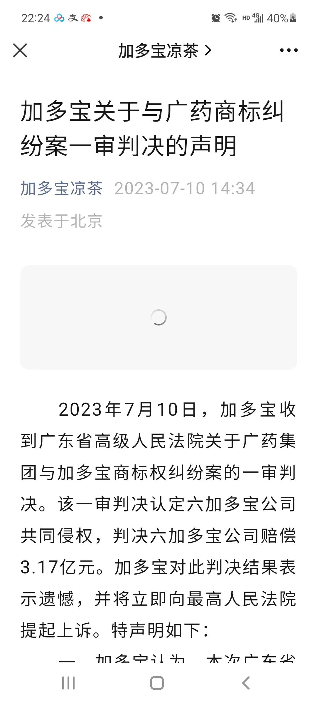 值得一提的是,昨日晚间,加多宝也在其官方微信公众号发布声明回应此事。声明称,加多宝收到广东省高级人民法院关于广药集团与加多宝商标权纠纷案的一审判决。该一审判决认定六加多宝公司共同侵权,判决六加多宝公司赔偿3.17亿元。加多宝称对此判决结果表示遗憾,并将立即向最高人民法院提起上诉。
