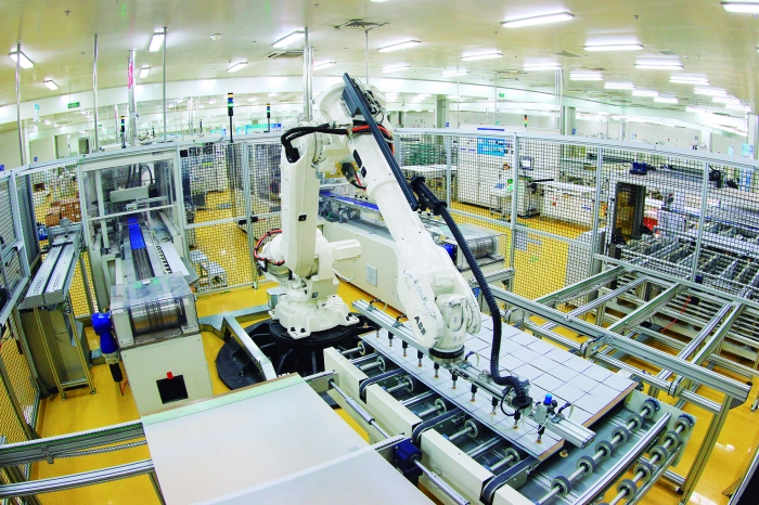 铝液注入模具,加压、冷却,成型……在立中集团保定清苑产业区的机加车间,两只自动化机械手正在对轮毂“毛刺”进行检测和清除;在包装区,银闪闪的车轮成品正在自动码垛机的快速操作下码成约1米多高的方垛,等待出厂交付。整个车间里,工人寥寥无几。
