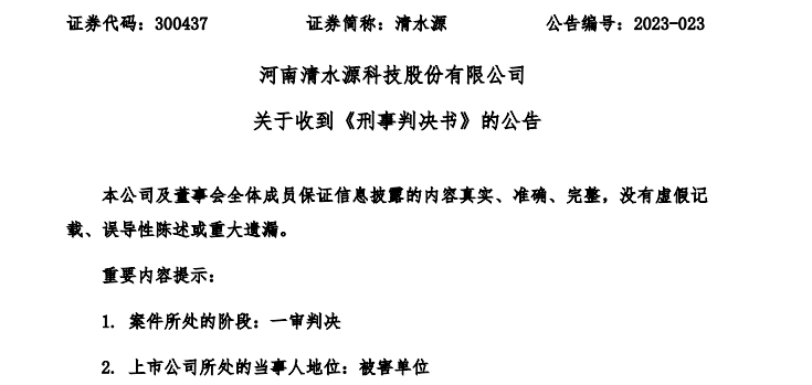 7月16日晚间,清水源发布公告称,近日收到河南省济源中级人民法院出具的《刑事判决书》。