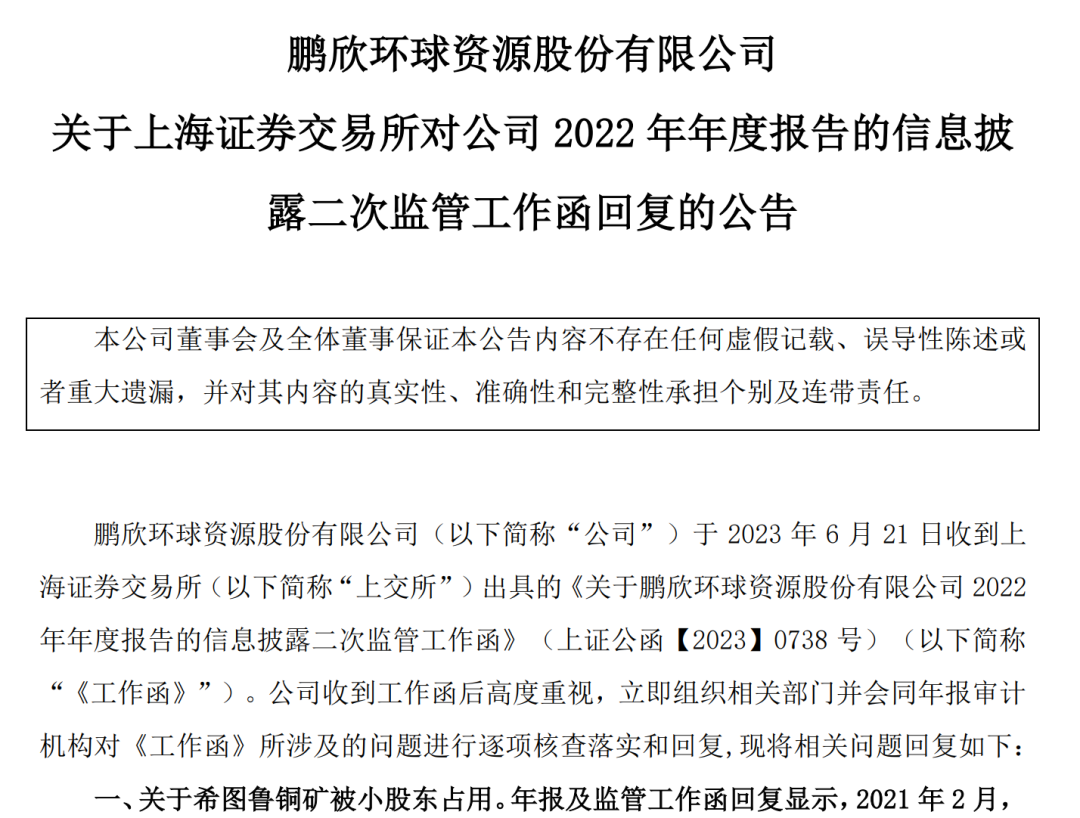6月21日,鹏欣资源收到上交所出具的《关于公司2022年年度报告的信息披露二次监管工作函》,被要求披露关于希图鲁铜矿被小股东占用的具体情况。