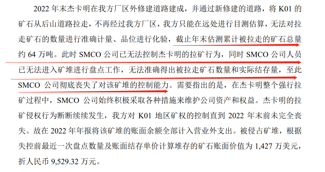 据此前年报及监管工作函回复显示,2021年2月,杰卡明已到SMCO现场开展地质调查,并于当年4月表示矿堆底下有其尾矿;5月底,杰卡明的合作伙伴已到SMCO拉走矿石。2021年6月起,SMCO已向当地检察院等声明被占用矿堆的所有权。