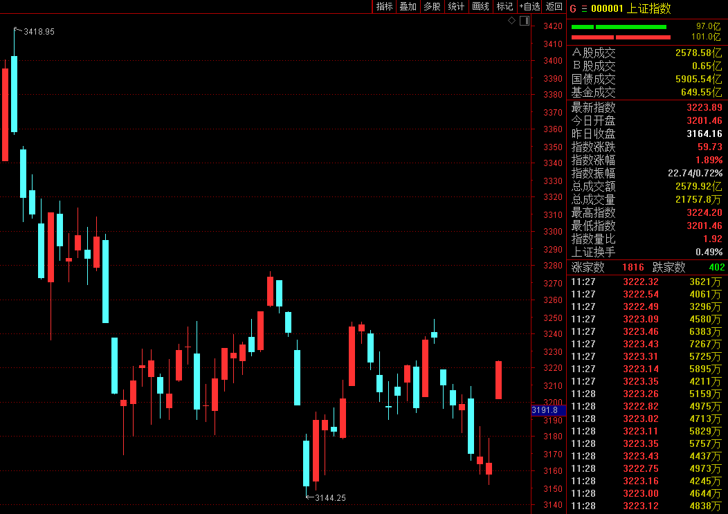 今日早盘,受政治局会议利好刺激,A股全线高开高走,上证指数直接跳开至3200点以上,沪深300、上证50等代表绩优蓝筹股的指数均涨超2%。两市成交急剧放大,半日成交接近昨日全天成交。两市超4100股飘红。