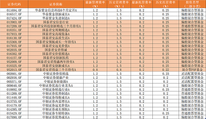 上述费率调整特点在近期的华泰资管、国泰君安资管以及中银国际证券三家跟进降费的机构中也有体现,三家机构首批跟进下调费率的产品数量分别为3只、13只和12只,而从投资类型看,也是以偏股混合型产品居多。