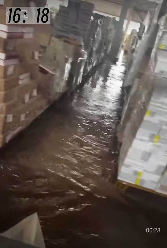 中图网视频号记录了洪水袭来的经过:下午2时57分,洪水漫过脚背,有人在水中行走,托运沙袋阻挡洪水;下午3时19分,洪水涨至小腿处,有物体漂浮于水面;下午4时16分,洪水涌入库房,一些人员正往高处撤离,一辆越野车半截没入水中。此时,一楼的办公室内全是洪水,工作人员正将电脑和书籍搬运到二楼;下午4时28分,洪水从卷帘门急速涌入库房。