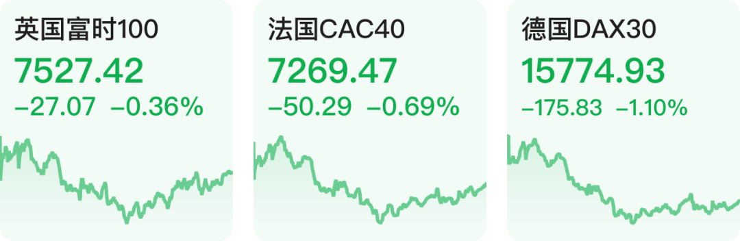 欧洲三大指数全部下跌。截至收盘,英国富时100指数跌0.36%,法国CAC40指数跌0.69%,德国DAX30指数跌1.1%。