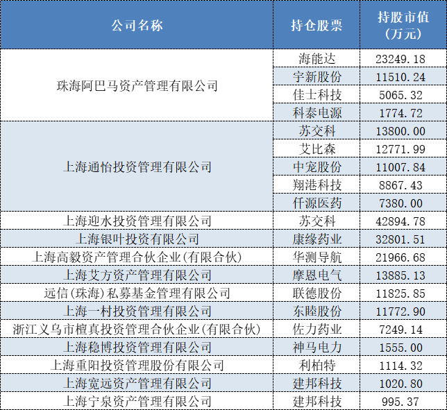 除此之外,截至今年中报时,还有摩恩电气(002451.SZ)被艾方资产持仓1.39亿元;艾比森(300389.SZ)和中宠股份(002891.SZ)分别被通怡投资持仓1.28亿元和1.1亿元;联德股份(605060.SH)、东睦股份(600114.SH)和宇新股份(002986.SZ)依次分别被远信私募、一村投资和阿巴马资产持仓1.18亿元、1.18亿元和1.15亿元等。