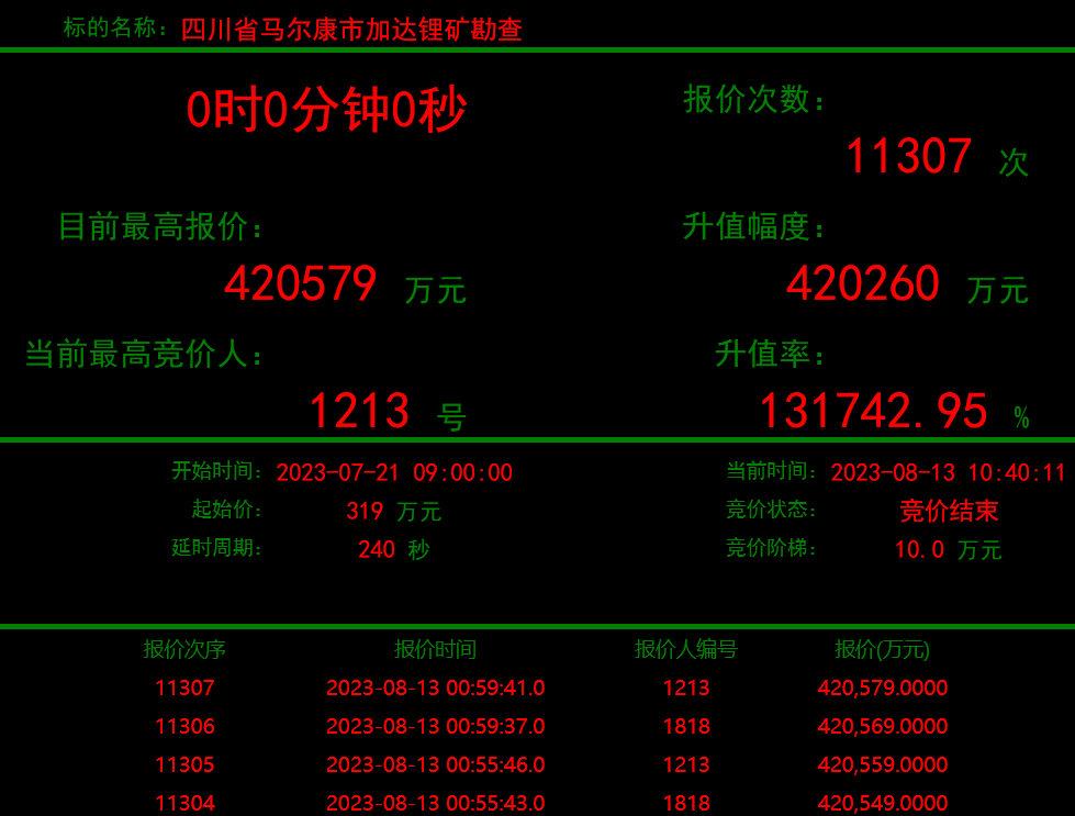 经过3天3夜的激烈争夺、11307次报价,编号为1213号的竞价人,最终以42.06亿元竞得马尔康市加达锂矿勘查,较起始价飙升逾1317多倍。