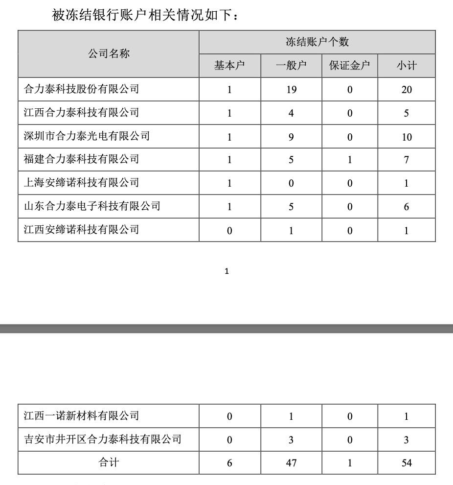 合力泰透露,截至2023年8月11日,上市公司及子公司由于合同纠纷和票据追索,导致被冻结银行账户累计为54个。其中,基本户6个、一般户48个,实际冻结累计金额折合为1.18亿元。