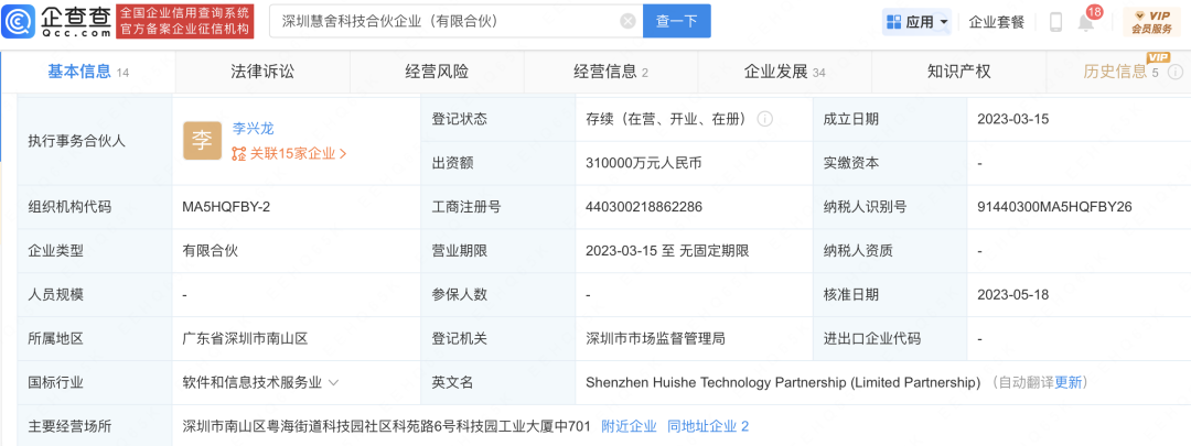 据企查查数据显示,慧舍科技成立于2023年3月15日,执行事务合伙人为李兴龙,出资额31亿元,该公司经营范围包括信息咨询服务(不含许可类信息咨询服务)、财务咨询、企业管理等。