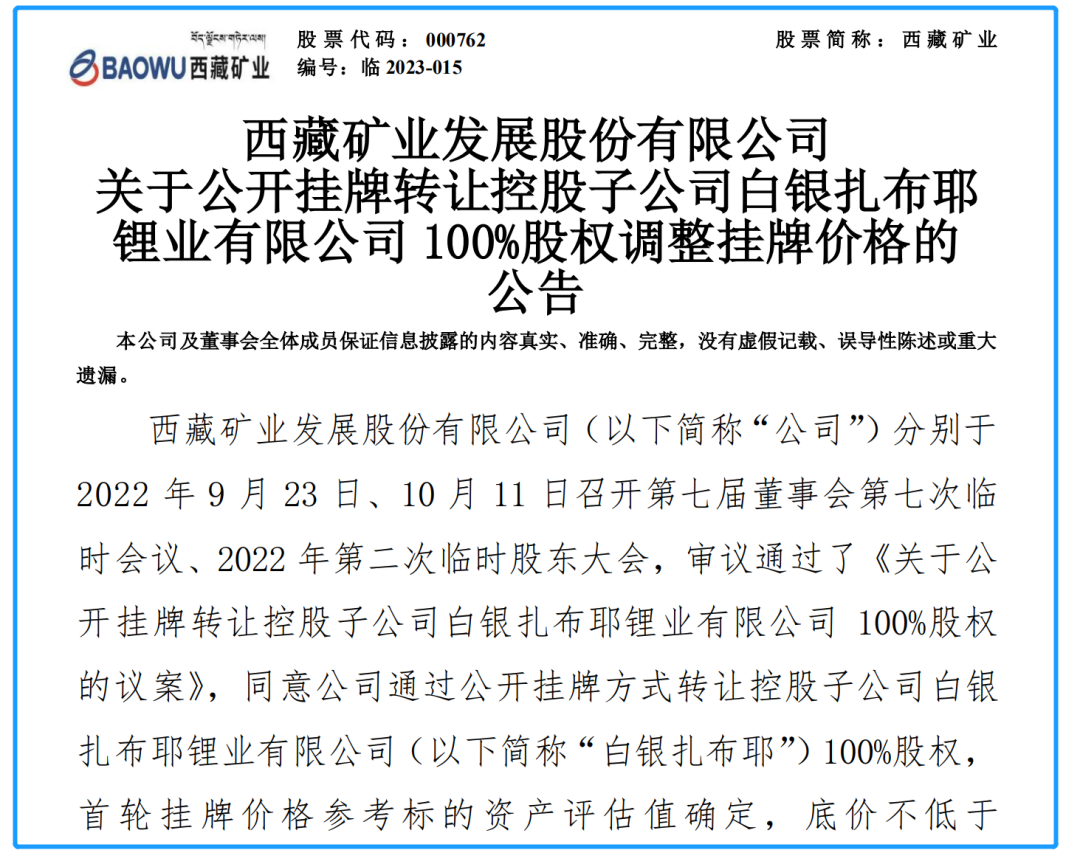 最终,西藏矿业分别于2022年9月、10月,召开董事会临时会议和临时股东大会,审议通过了《关于公开挂牌转让白银扎布耶100%股权的议案》。同时,白银扎布耶首轮挂牌价格参考标的资产评估值得到确定,底价不低于6.84亿元。