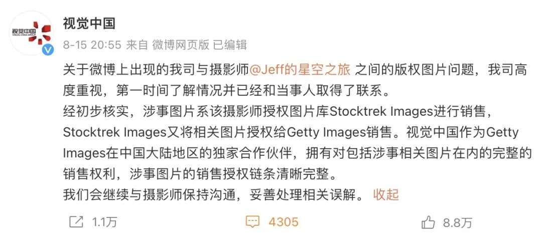 当日晚间,视觉中国通过官方微博回应称:“关于微博上出现的我司与摄影师‘@Jeff的星空之旅’之间的版权图片问题,我司高度重视,第一时间了解情况并已经和当事人取得了联系。”