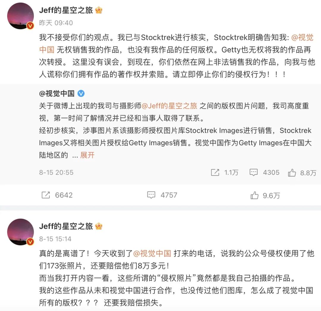 8月15日,星空摄影师戴建峰(@Jeff的星空之旅)发文称:“今天收到了视觉中国打来的电话,说我的公众号侵权使用了他们173张照片,还要赔偿他们8万多元!而当我打开内容一看,这些所谓的‘侵权照片’竟然是我自己拍摄的作品。”