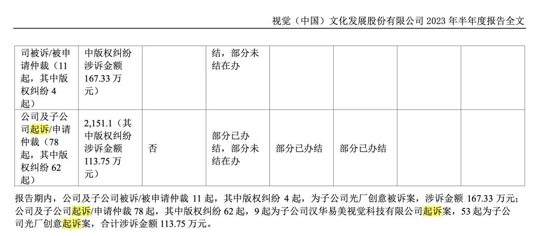 视觉中国披露,上半年,公司及子公司被诉/被申请仲裁11起,其中版权纠纷4起,为子公司光厂创意被诉案,涉诉金额167.33万元;公司及子公司起诉/申请仲裁78起,其中版权纠纷62起,9起为子公司汉华易美视觉科技有限公司起诉案,53起为子公司光厂创意起诉案,合计涉诉金额113.75万元。