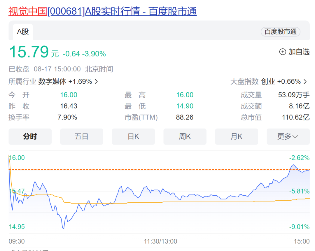 从二级市场来看,随着上述事件的进一步发酵,视觉中国的股价也受到了影响。8月16日,视觉中国A股股价低开低走,截至收盘,股价下跌4.86%,全天市值蒸发近6亿;8月17日,视觉中国低开跳水,股价盘中跌幅一度超过9%,最终下跌3.9%,市值继续缩减4.49亿元至110.62亿元。
