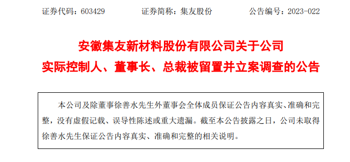 今年1月29日,集友股份公告,公司于1月20日(农历腊月二十九)收到重庆市巴南区监察委员会签发的“关于对公司实际控制人、董事长、总裁徐善水个人因涉嫌行贿而被留置并立案调查的通知书”。