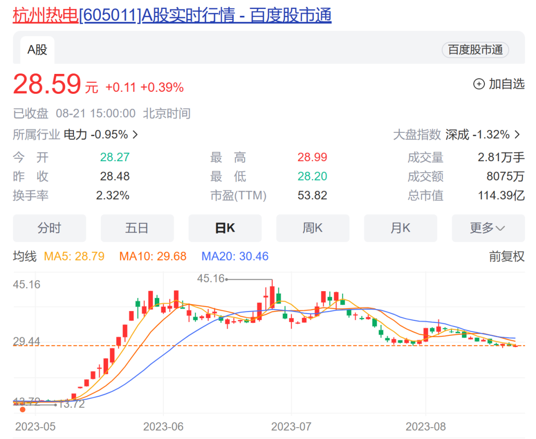 今年6月28日,杭州热电的股价创下了历史新高,一度冲高至45.16元/股。截至8月21日,公司股价收盘于28.59元/股。较前期高点已下跌了约3成。
