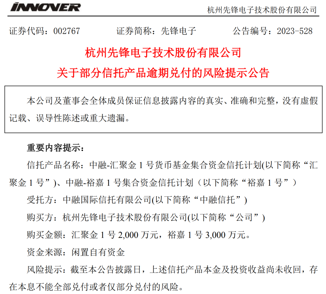 先锋电子8月21日晚间公告,2022年8月15日至17日,公司分别使用闲置资金3000万元、2000万元购买了中融信托的裕嘉1号和汇聚金1号信托产品。截至公告披露日,上述信托产品本金及投资收益尚未收回,存在本息不能全部兑付或者仅部分兑付的风险。