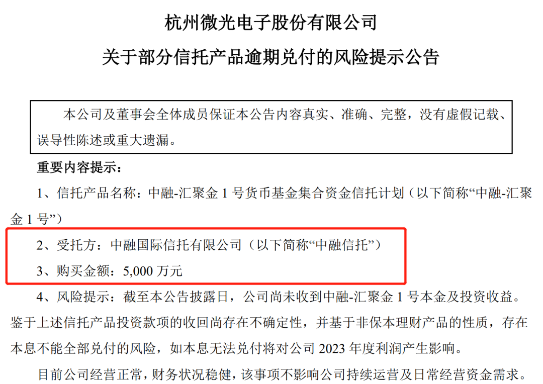 微光股份同日也披露了部分信托产品逾期兑付的风险提示公告。2023年5月22日,微光股份购买了中融信托发行的信托产品中融-汇聚金1号,金额为5000万元,预期年化收益率5.4%,到期日为2023年8月21日。