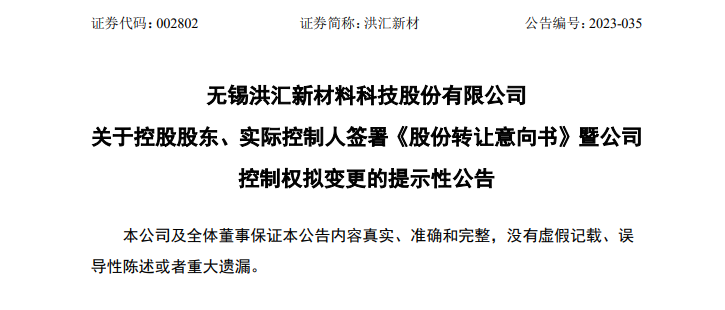 公司8月23日晚间公告称,公司控股股东、实际控制人项洪伟先生与施宁娣女士签署了《股份转让意向书》,项洪伟拟将其持有的公司29.99%的股份(对应股票数量 5467.24万股)协议转让给施宁娣。上述交易完成后,施宁娣将成为洪汇新材新任实际控制人。