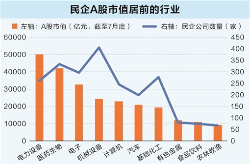 目前,A股市场上已经涌现出一批高科技公司。新能源、医药、电子信息等高科技产业明星民企扎堆,包括以宁德时代、比亚迪等为代表的新能源产业,以恒瑞医药、药明康德为代表的医药生物板块,以及海康威视、立讯精密等为代表的电子信息产业等。民企高科技产业已成为A股重要一极。数据显示,截至7月底,电力设备、医药生物、电子等科技公司扎堆的行业,民营企业A股市值均超3万亿元,位居前列。