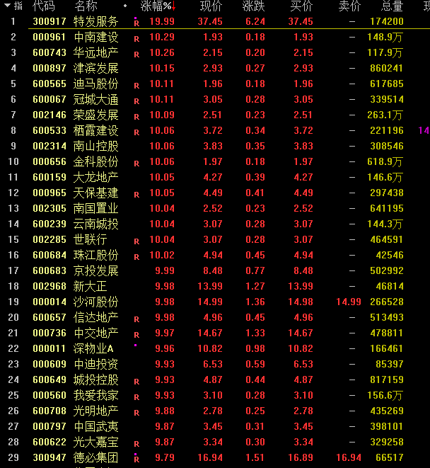 在房地产股强势带动下,物业管理、租购同权、新型城镇、家居用品等相关板块亦跟随大幅上涨,西大门、南国置业、世联行等涨停。