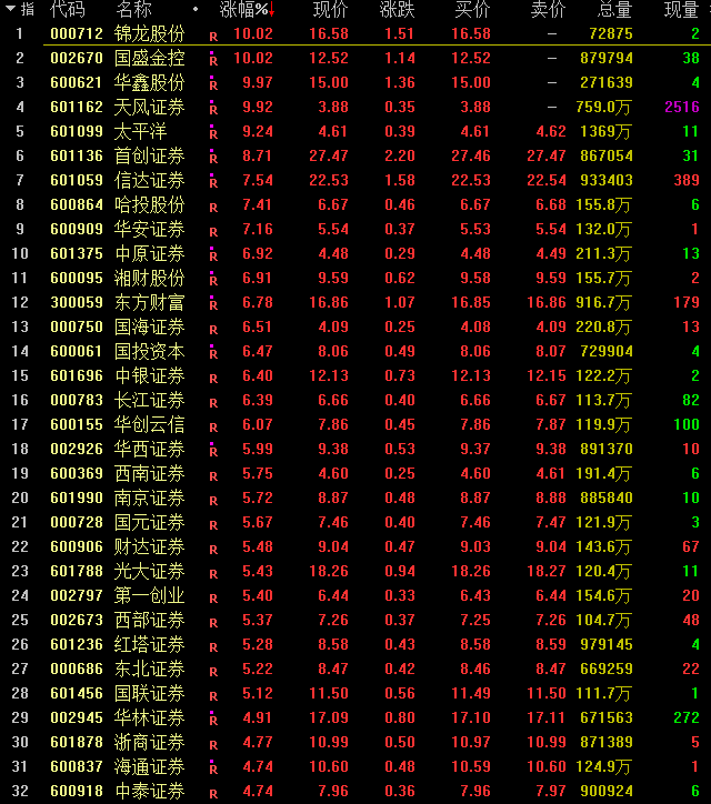 券商股开盘几近全线涨停,板块指数高开10.47%,逼近前期高点,仅10分钟的成交,就超过前一交易日全天成交。不过,这种全线涨停的盛况仅持续了几分钟,大部分个股在巨量获利盘冲击下打开涨停。截至午间收盘,仅锦龙股份、国盛金控、华鑫股份、天风证券少数几只个股保持涨停状态。