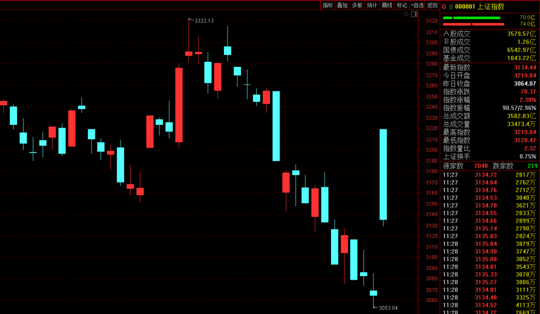 在上周末诸多重磅利好的作用下,今日早盘A股全线高开,上证指数、深证成指等股指均跳空高开逾5%,一度逾百股涨停或涨超10%。后大盘逐级回调,截至午间收盘,各股指均回吐了一半以上涨幅。两市成交急剧放大,半日成交7776亿元,超前一交易日全天成交,两市上涨个股超4700只。
