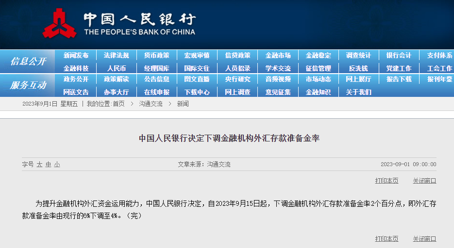 消息面上,据央行网站消息,为提升金融机构外汇资金运用能力,中国人民银行决定,自2023年9月15日起,下调金融机构外汇存款准备金率2个百分点,即外汇存款准备金率由现行的6%下调至4%。