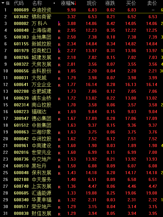 地产股也迅速拉升,中迪投资快速涨停,金科股份、天房发展、荣盛发展、金地集团等跟涨。