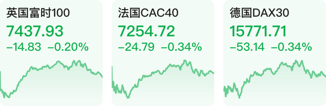 欧洲三大指数全部下跌。截至收盘,英国富时100指数跌0.2%,法国CAC40指数跌0.34%,德国DAX30指数跌0.34%。