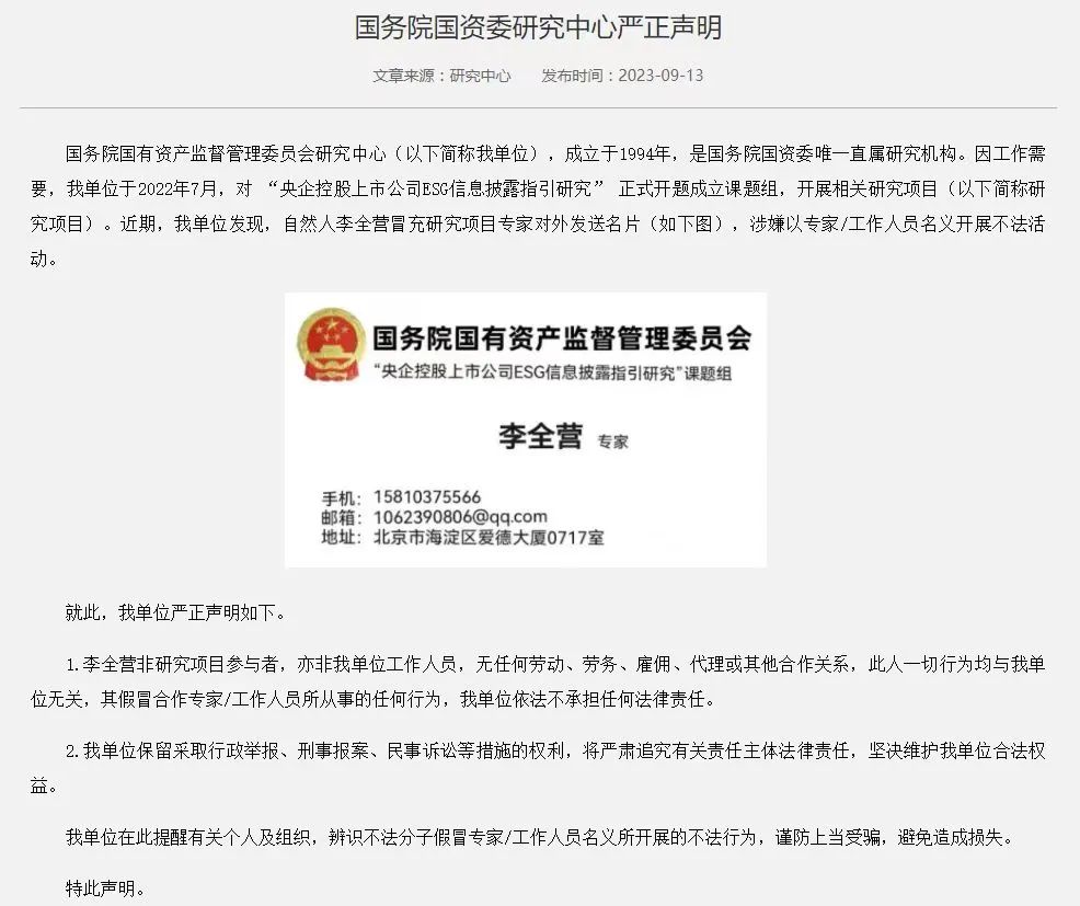 研究中心强调称,自己是国务院国资委唯一直属研究机构。李全营非上述研究项目参与者,亦非其单位工作人员,无任何劳动、劳务、雇佣、代理或其他合作关系,“此人一切行为均与我单位无关,其假冒合作专家/工作人员所从事的任何行为,我单位依法不承担任何法律责任。”