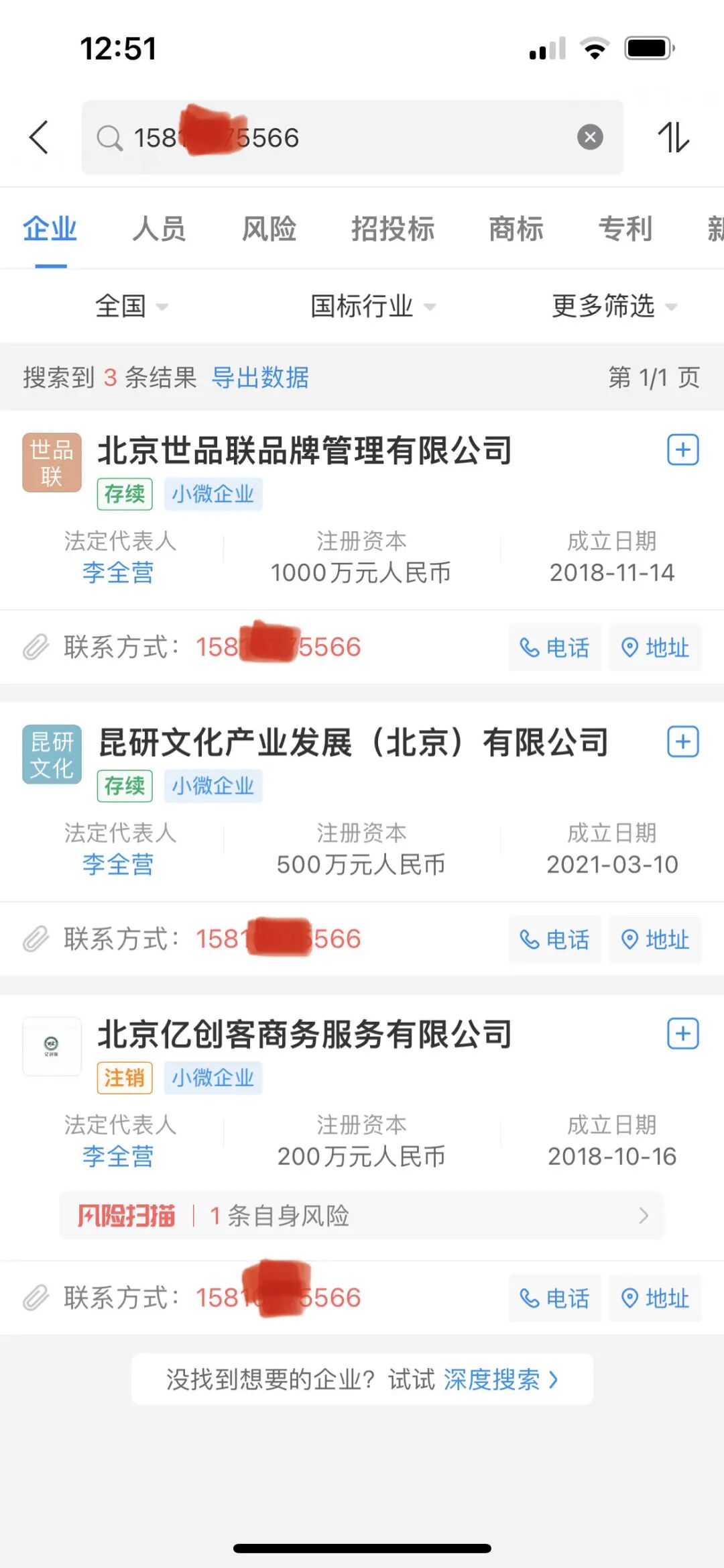 记者还注意到,企查查显示,李全营名片上的手机号码是北京世品联品牌管理有限公司(下称“世品联品牌”)、昆研文化产业发展(北京)有限公司(下称“昆研文化”)、北京亿创客商务服务有限公司(下称“亿创客商务”,已于2021年6月注销)的企业联系电话。而这三家公司的控股股东、法定代表人、执行董事、经理均为李全营,三家公司的联系邮箱也与李全营名片上的邮箱一致。
