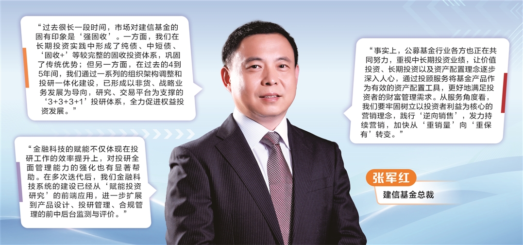 权益投资实力是衡量一家资管公司的重要指标。张军红表示:“过去很长一段时间,市场对建信基金的固有印象是‘强固收’。一方面,我们在长期投资实践中形成了纯债、中短债、‘固收+’等较完整的固收投资体系,巩固了传统优势;但另一方面,在过去的4到5年间,我们通过一系列的组织架构调整和投研一体化建设,已形成以非货、战略业务发展为导向,研究、交易平台为支撑的‘3+3+3+1’投研体系,全力促进权益投资发展。”