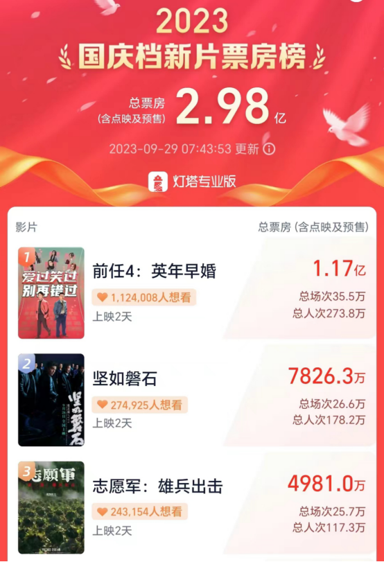 从实时数据来看,截至9月29日7时许,《前任4》《坚如磐石》《志愿军:雄兵出击》三部影片票房分别已达1.17亿元、7826万元、4980万元。