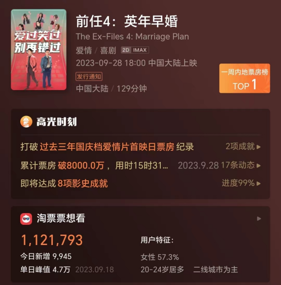 “前任”系列此前已陆续上映3部,是国内颇具影响力的系列爱情电影,尤其是2017年上映的《前任3:再见前任》揽获19.41亿元票房。猫眼专业版显示,《前任4》票房预测达15.92亿元。