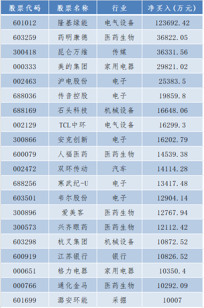 受节日效应影响,本周仅有20只个股获得北上资金的超亿元的净买入,其中医药生物行业占5家,数量居首位。分别为药明康德(3.68亿元)、人福医药(1.45亿元)、爱美客(1.28亿元)、兴齐眼药(1.21亿元)、通化金马(1.03亿元)。