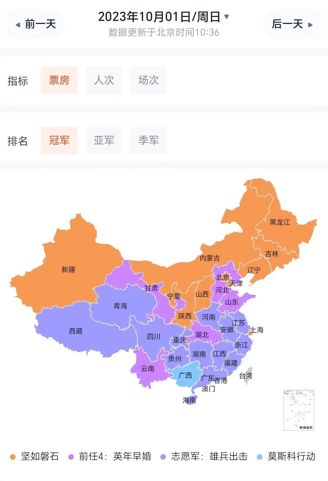 9月30日、10月1日的票房分布则更多样化。10月1日的预售数据显示,《坚如磐石》《志愿军》分别在11个、14个省份成为预售冠军。剩余6个省份中,河北、山东、湖北、甘肃、云南预售冠军为《前任4》,广西的预售冠军为《莫斯科行动》。