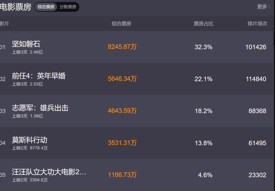 截至目前,票房排名前四的影片分别为《前任4》《坚如磐石》《志愿军》《莫斯科行动》,4部影片无论在票房还是排片上,都尚未拉开差距。