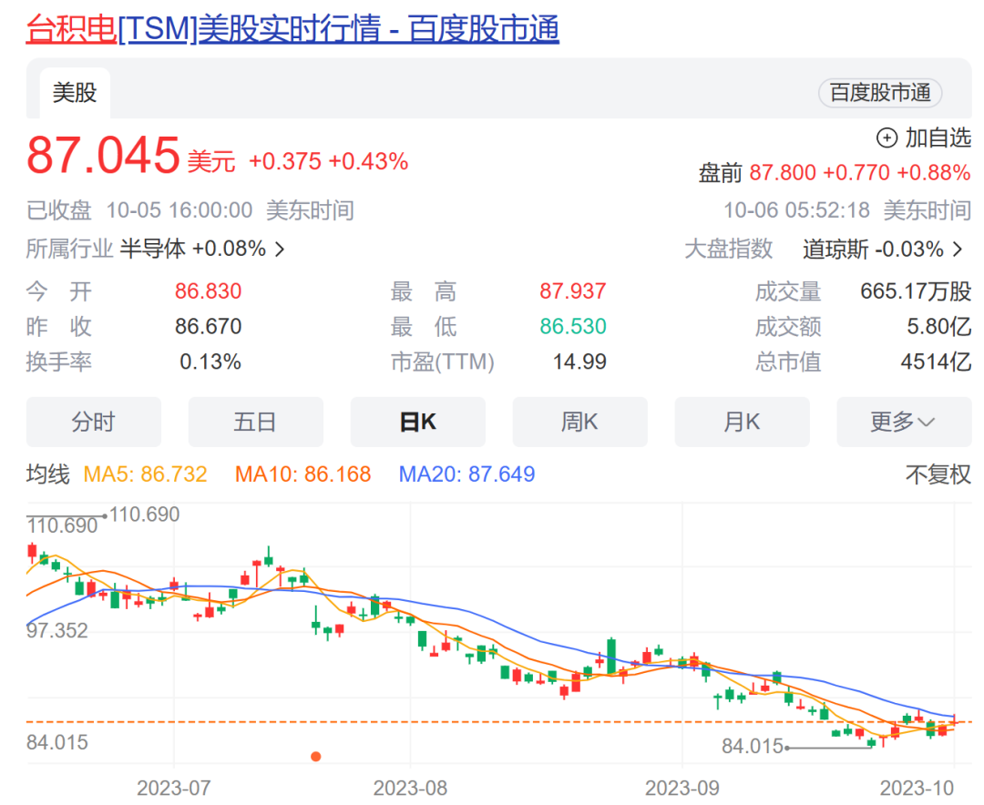 报道援引彭博社的报道称,投资者对宏观环境、全球消费电子需求疲软的担忧,导致台积电美股股价自6月的高点至今累计跌幅达20%。
